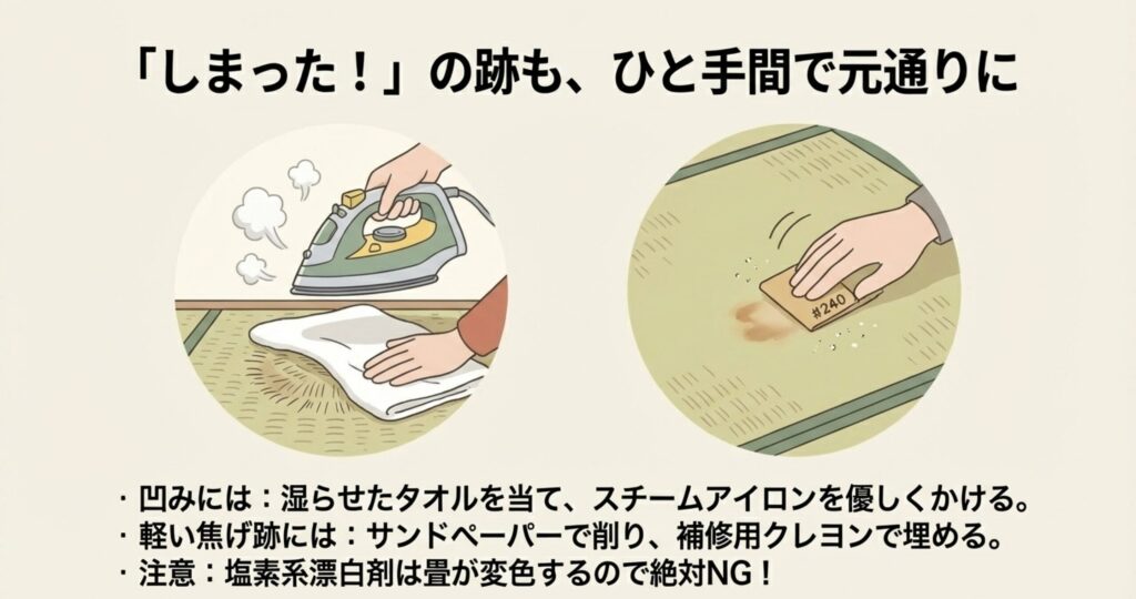 もし万が一、熱で少し焦げてしまった場合は、サンドペーパー(#240くらい)で優しく表面を削り、畳の色に近い補修用クレヨンや、木工ボンドにい草の削りカスを混ぜたパテで埋めるというDIY手法もあります。ただ、広範囲の場合は無理せず畳屋さんに相談してくださいね。