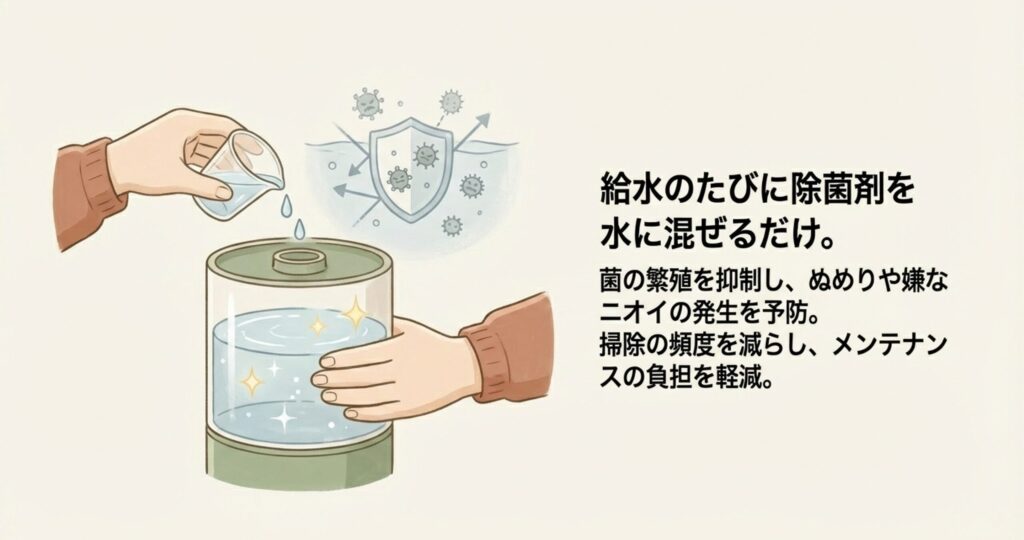 「掃除がしにくいタワー型のタンクを、どうやって清潔に保てばいいの?」という方におすすめしたいのが、除菌剤の活用です。