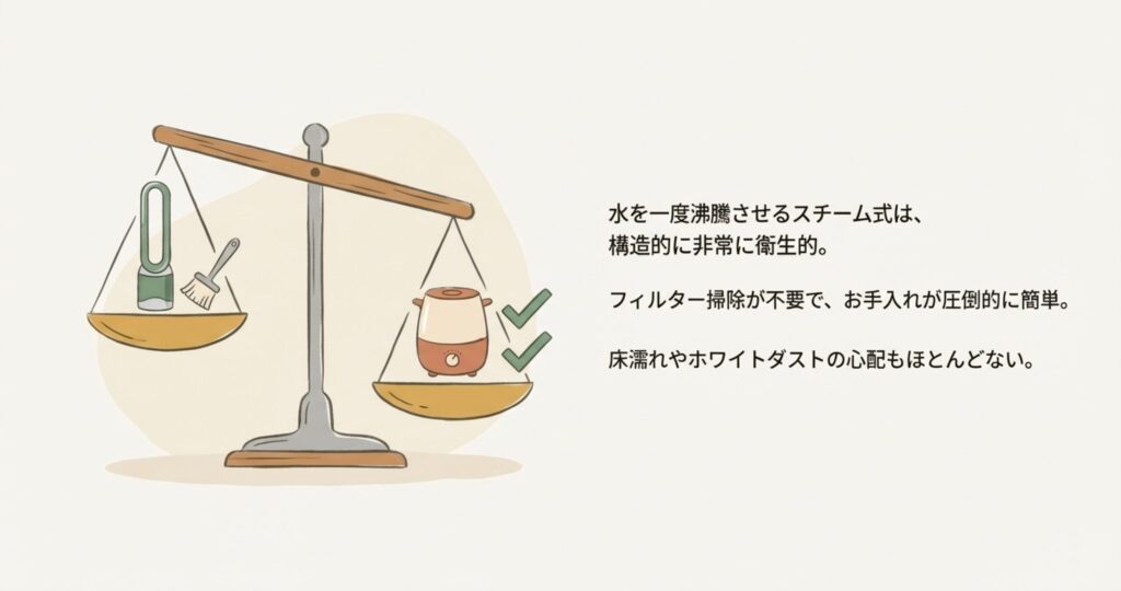 これは水を沸騰させて蒸気にするので、フィルター掃除が不要で、お手入れが劇的にラクなんです。蒸気として放出されるので、超音波式のような床濡れやホワイトダストの心配もほとんどありません。