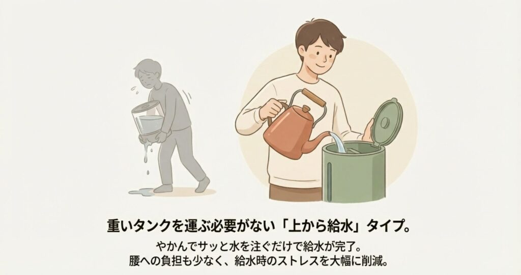 わざわざ重いタンクを持ち運ばなくても、やかんで水を注ぐだけで完了するので、腰への負担もありません。
