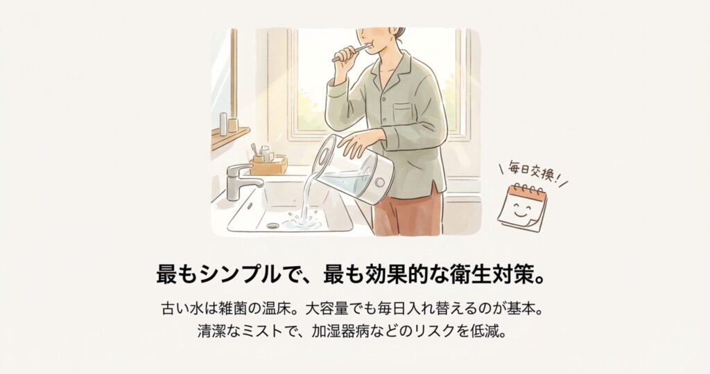 どんなに高機能な加湿器でも、一番大切なのは「毎日のお水の入れ替え」です。