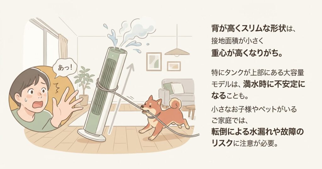 タワー型加湿器の最大の特徴である「細長さ」は、裏を返せば接地面積が小さく、重心が高くなりやすいという性質を持っています。