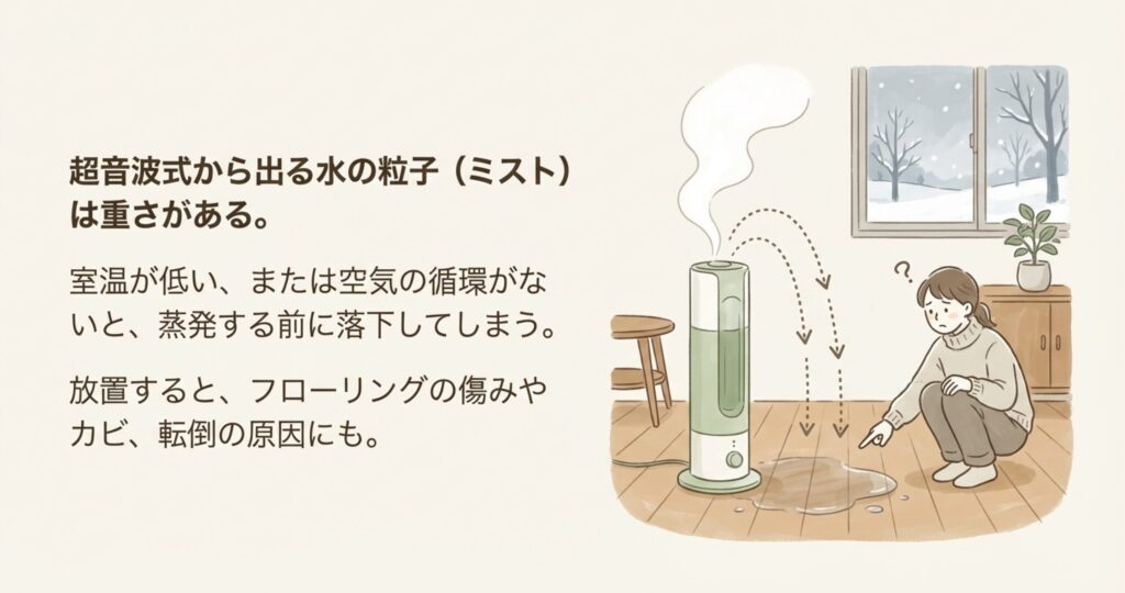 超音波式は水を細かい「粒」にして飛ばしているのですが、このミストは意外と重さがあるんですよね。お部屋の空気が冷えていたり、空気の循環がなかったりすると、ミストが蒸発する前に重力で下に落ちてきてしまうんです。