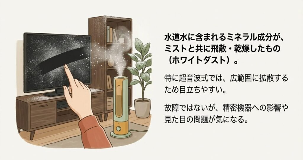 加湿器を使っていると、テレビの画面や黒い家具にうっすらと「白い粉」がついているのを見たことはありませんか?