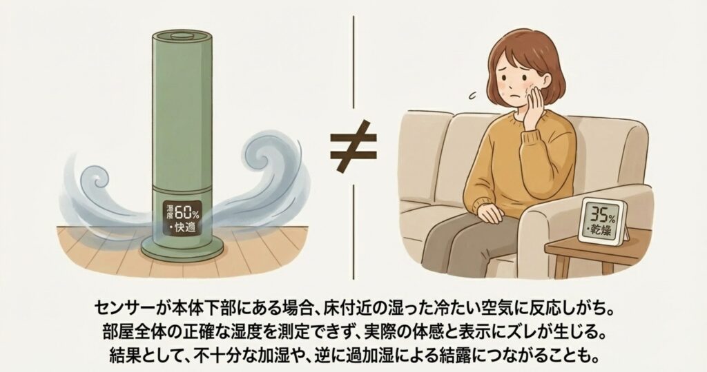 本体の下の方にセンサーがあるタイプだと、先ほどお話しした「下に落ちてきたミスト」や「床付近の冷たい空気」に反応してしまい、お部屋全体の正確な湿度を測れないことがあります。