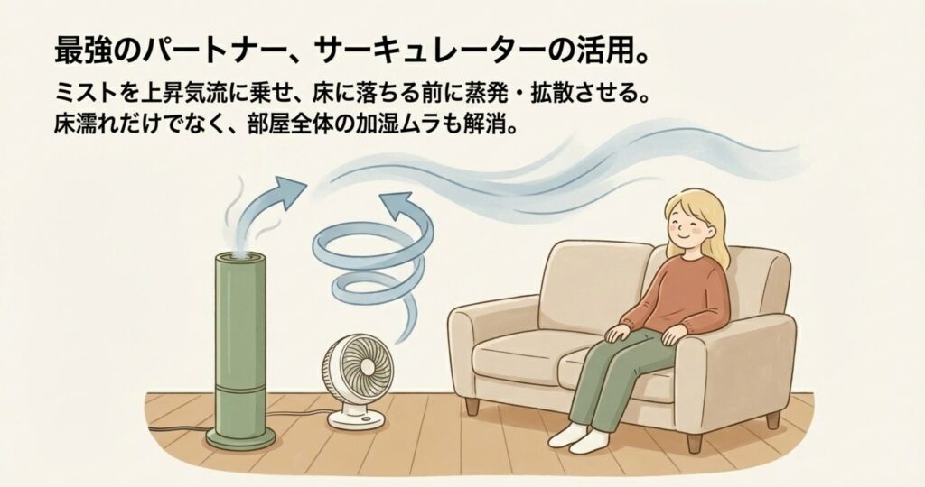 タワー型加湿器から出たミストを、サーキュレーターの風で上方向へ押し上げて、お部屋全体に拡散させるんです。こうすることで、ミストが床に落ちる前に空気と混ざって蒸発しやすくなり、床が濡れるリスクを劇的に減らせますよ。