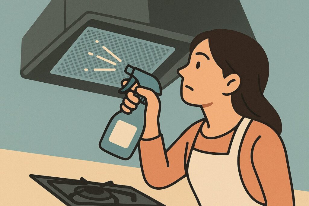 1. まず、換気扇のフードやファン、フィルター全体に、アルカリ性洗剤(セスキ水スプレーやマジックリンなど)を吹きかけます。