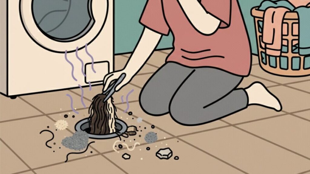 洗濯機から急にドブのような臭いがしてきたら、それは排水口に溜まった汚れが原因である可能性が非常に高いです。洗濯をすると、衣類に付着していた髪の毛や糸くず、皮脂汚れ、そして溶け残った洗剤などが水と一緒に流れていきます。