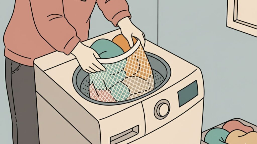 下着などのデリケートな衣類を守るために便利ですが、ネットに衣類を詰め込みすぎたり、ネットをたくさん使いすぎたりすると、それ自体が水の抵抗を受けて一つの塊のようになり、偏りを引き起こします。洗濯ネットを使う際は、中に余裕を持たせ、数も少なめにすると良いですね。