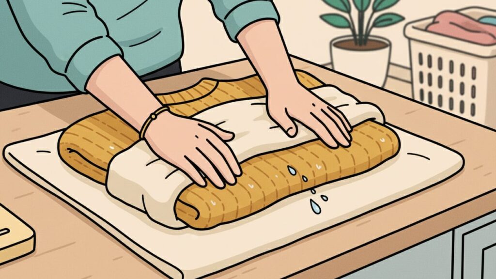 これはバスタオルを使って水分を吸い取らせる方法で、型崩れの心配がほとんどなく、どんな衣類にも使える万能なテクニックなんですよ。とても簡単なのに効果は抜群なので、ぜひ覚えておいてほしい方法です。