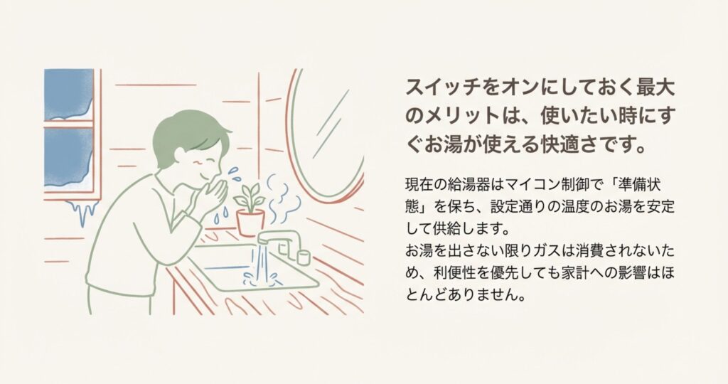 給湯器のリモコンスイッチを「入」の状態にしておく最大のメリットは、何と言っても「使いたい時にすぐお湯が出る」という圧倒的な利便性です。