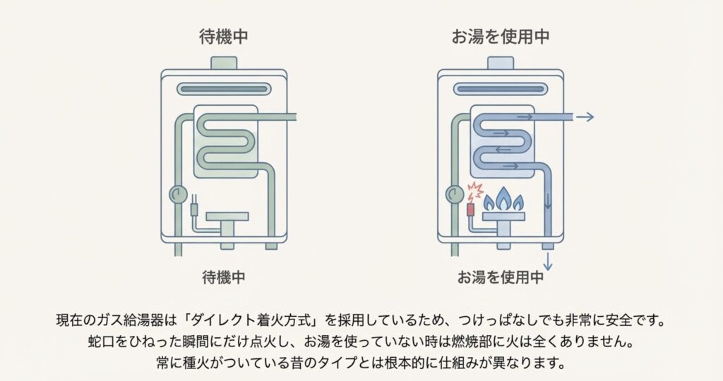 昔の機種とは違い、今のガス給湯器は「ダイレクト着火方式」を採用しているからです。