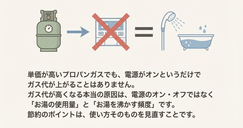 プロパンガス代が高くなる本当の原因は、電源の入れっぱなしではなく、「お湯の使用量」と「お湯を沸かす頻度」にあります。
