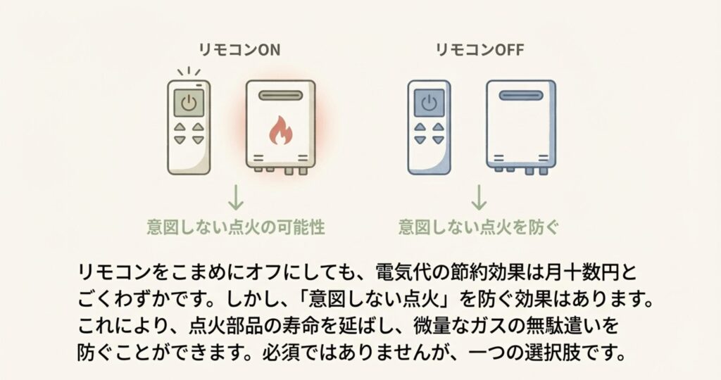 電気代の節約効果は月十数円と微々たるものですが、実は「意図しない点火を防ぐ」という意味では、リモコンを消すことには大きな価値があるんです。