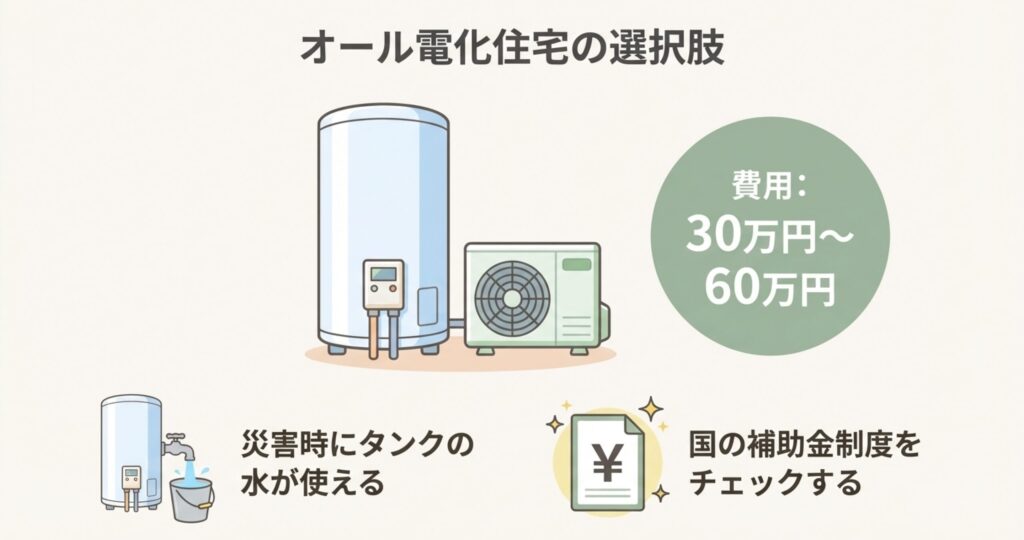 交換費用 ガス:10〜30万、電気:30〜60万 補助金制度の有無を確認すること