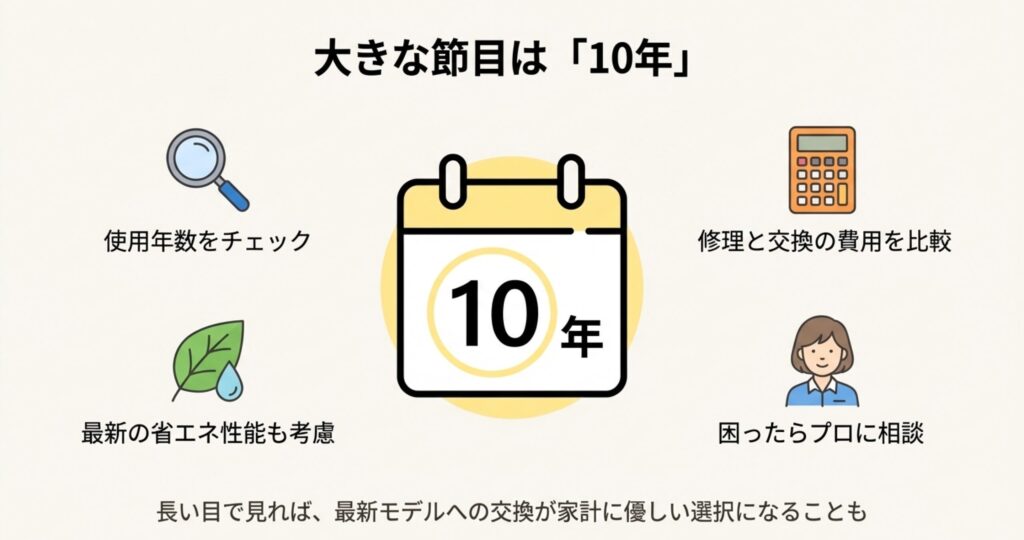 というのも、10年を過ぎるとメーカーの部品保有期間が終わっていて、修理したくても部品がない!なんてことが多いんですよ。