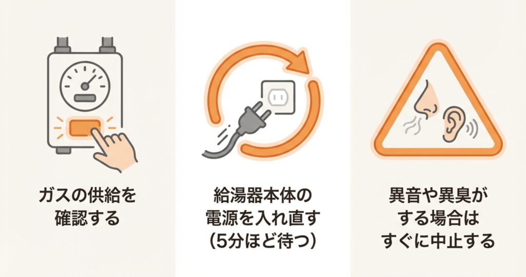 お湯が出ないと「もうダメだ!」って思いがちですが、実は単純なミスや一時的なエラーで止まっていることも多いんです。