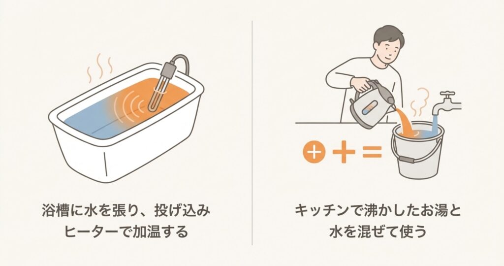 一番おすすめなのは、お風呂に水を張ってから投入型の電気ヒーターで温める方法ですね。