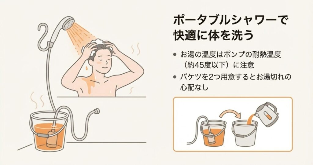 これ、バケツにお湯を溜めてポンプを沈めるだけで、いつものシャワーに近い感覚で洗えるんです。