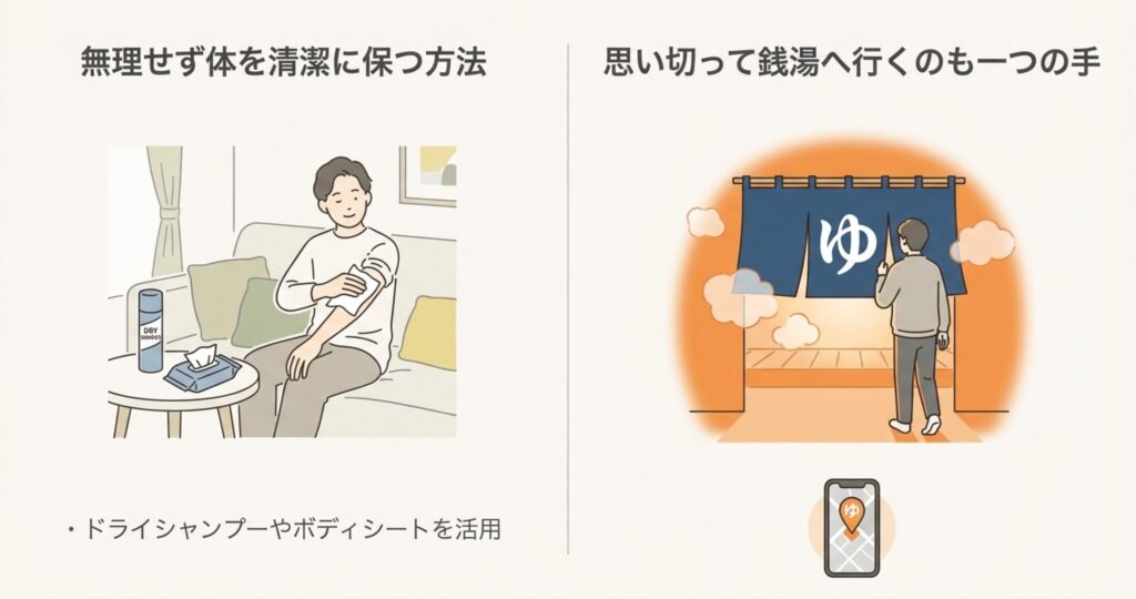 給湯器が動かなくなっても、身近なアイテムやちょっとした工夫で今夜の衛生環境を守る方法はたくさんあるんです。