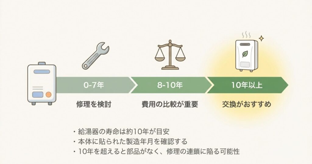 一般的に、給湯器の寿命はだいたい10年と言われています。本体に貼ってあるシールを見て、製造から何年経っているかチェックしてみてください。もし10年を超えているなら、私は迷わず「交換」をおすすめします。