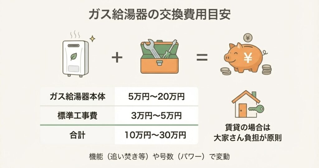 ガス給湯器を交換する場合、本体代と工事費を合わせて「10万円〜30万円」くらいが一般的な相場になります。