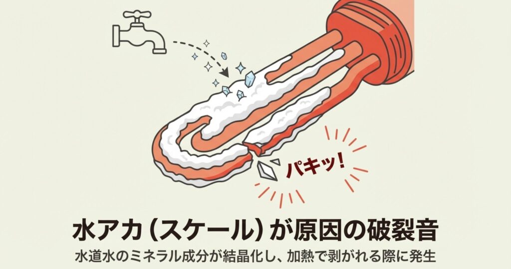 水道水に含まれるカルシウムやマグネシウムなどのミネラル成分が、加熱を繰り返すうちに結晶化して、白いガリガリした塊になります。これがヒーターの熱で膨張したり、剥がれたりする時に、乾いたような破裂音を出すことがあるんですよ。