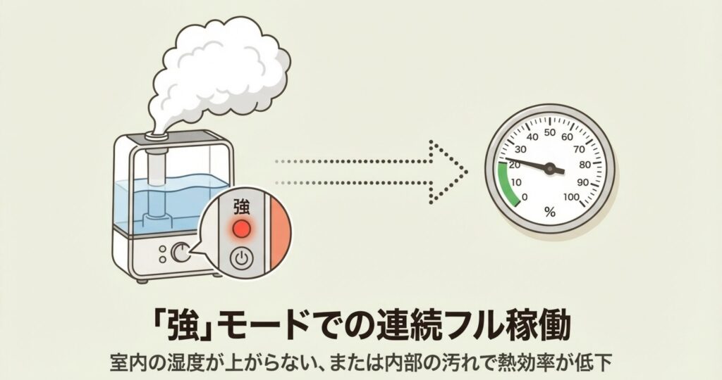 加湿が始まってから、いつまで経っても音が小さくならない場合、設定が「強」のままになっていたり、お部屋の湿度がなかなか上がらずにフル稼働し続けている状態かもしれません。