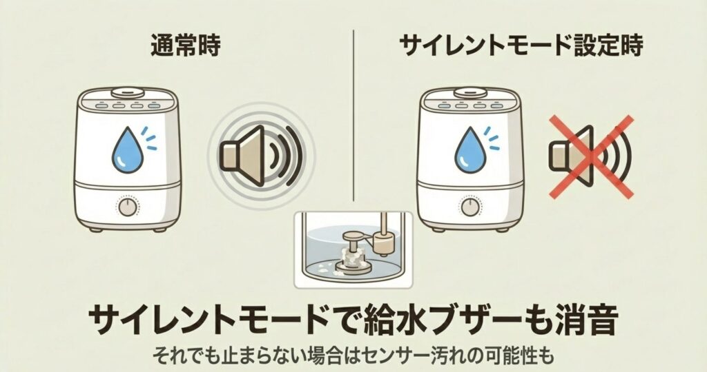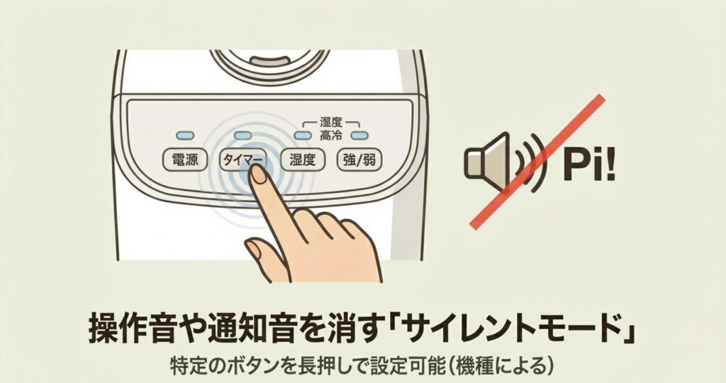 それから、「押したのに音が変わらない」という声もよく聞きますが、この機能はあくまで「お湯を沸かすまで」の音を抑えるもの。お湯が沸いて加湿が始まると、通常運転と同じ音量に戻ります。