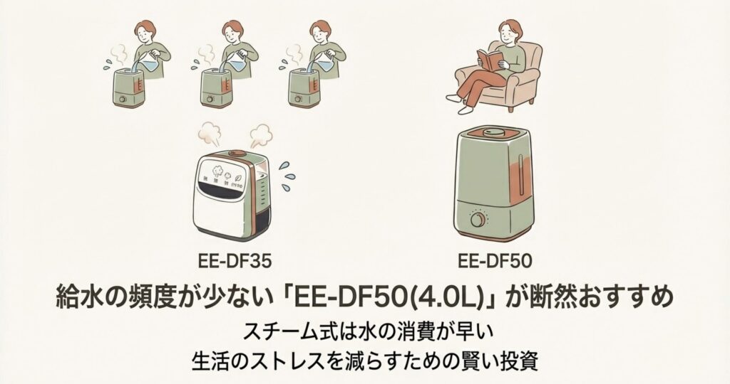 - モデル選び:給水の手間を減らしたいなら、断然「EE-DF50」がおすすめ。