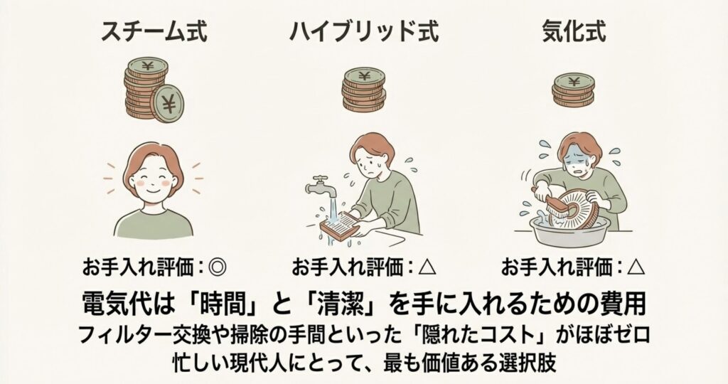 でもスチーム式は、水を沸騰させて雑菌を死滅させた清潔な蒸気を出しているんです。フィルター掃除の手間や、雑菌をバラ撒くリスクを電気代で解決していると考えれば、納得できる金額じゃないでしょうか。