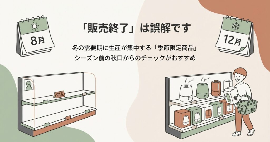 正確には、象印のスチーム式加湿器は「季節限定商品」として生産されているため、冬の需要がピークを過ぎる頃にはメーカー在庫がなくなってしまうんです。そのため、ネットショップや家電量販店の棚から姿を消してしまい、販売終了したように見えるわけですね。