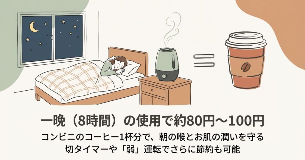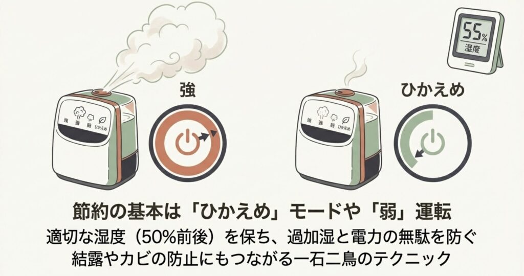 - 節約のコツ:「ひかえめ」モードやタイマーを使い、過剰な加湿を防ぐこと。