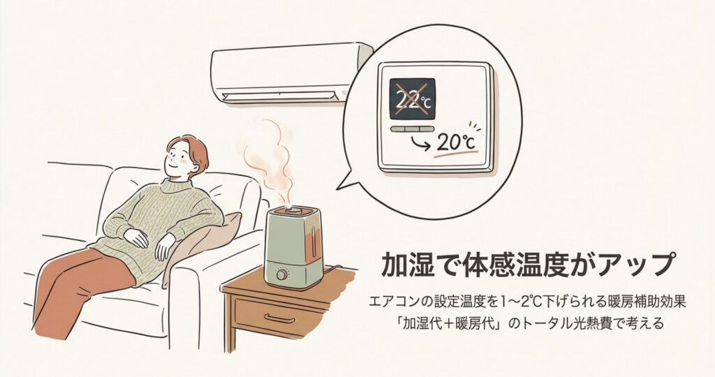 湿度が上がると体感温度も上がるので、エアコンの設定温度を1〜2度下げても同じくらい暖かく感じられるんです。
